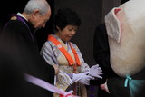 ご門首夫妻にテープカットのはさみを手渡すブットンくん。